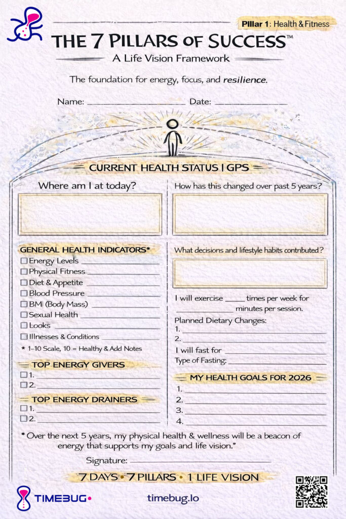 This Timebug Printable One Pager gives some guiding questions that can help you do a quick self-assessment and then make a Health Plan for 2026. Wherever you are at right now, just take stock, be honest, and then let’s set the navigation system North. Does it get harder with age? Of course, entropy and inertia are real forces of Nature! Which is why we need to adapt and change our strategies year to year, based on where we are at. It’s never too late to get healthier. Start today.